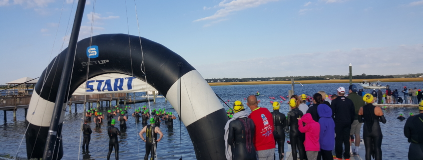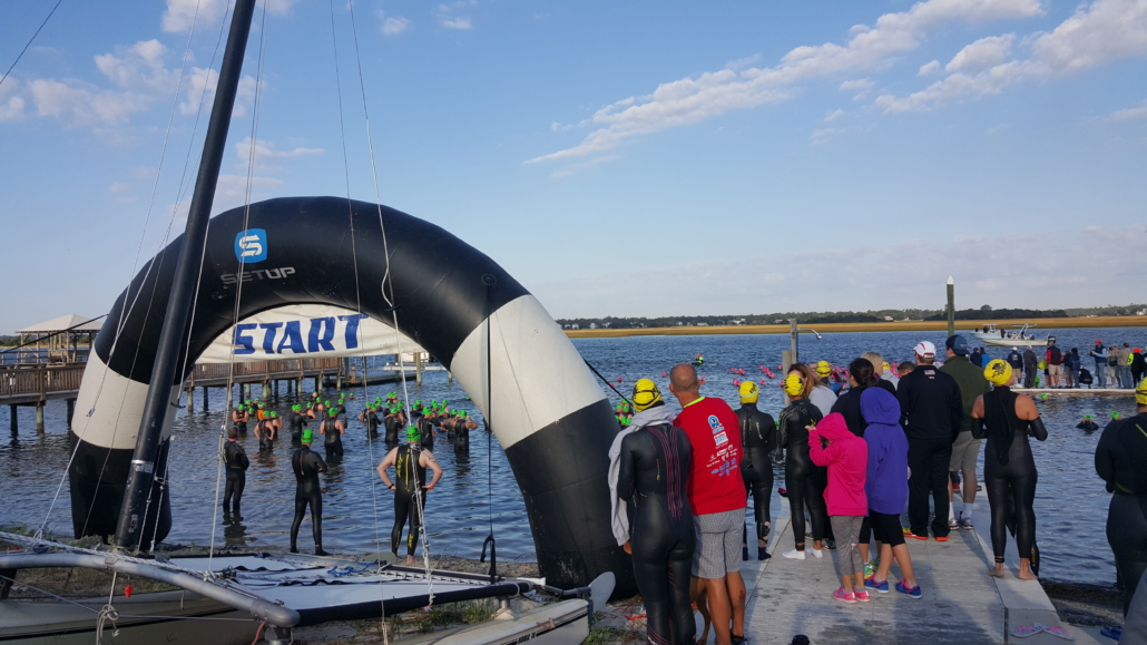 Try to seed yourself strategically so you’re feeling the most comfortable and can work towards your race day goals. The intercoastal waterway is notoriously fast, so like Coach Marty likes to say, you can at least just “be a bag of potato chips” and still make progress! However, it’s nice to have an alternative stroke (like on your back or breaststroke) if you need to take a break. Also, don’t hesitate to put your hand up and hang on a kayak or paddleboard to talk to someone, take a few deep breaths, and continue when you’re ready.